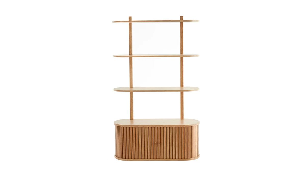 Le caisson oblong, composé de deux niches fermées (L45 x P32 x H37.1 cm) par portes coulissantes rideaux, offre une base stable pour accueillir l’étagère trois plateaux aux finitions arrondies. Livres, albums, cadres, objets déco trouveront pour sûr leur place sur cette bibliothèque murale. Parfait pour ranger sans tout cacher !