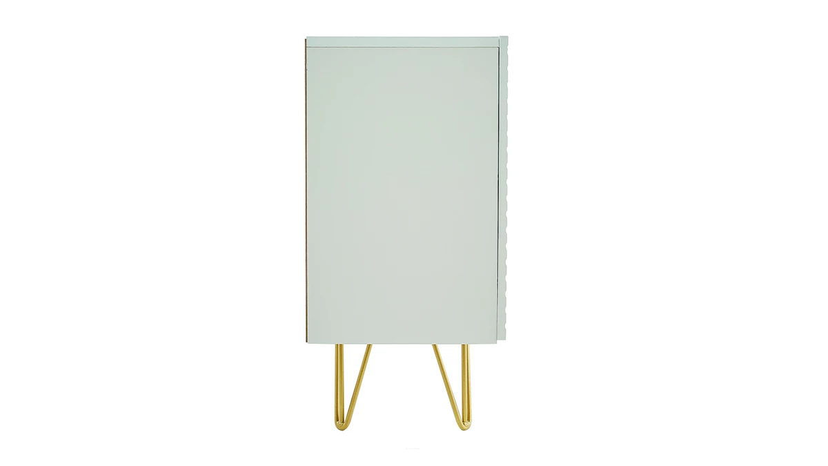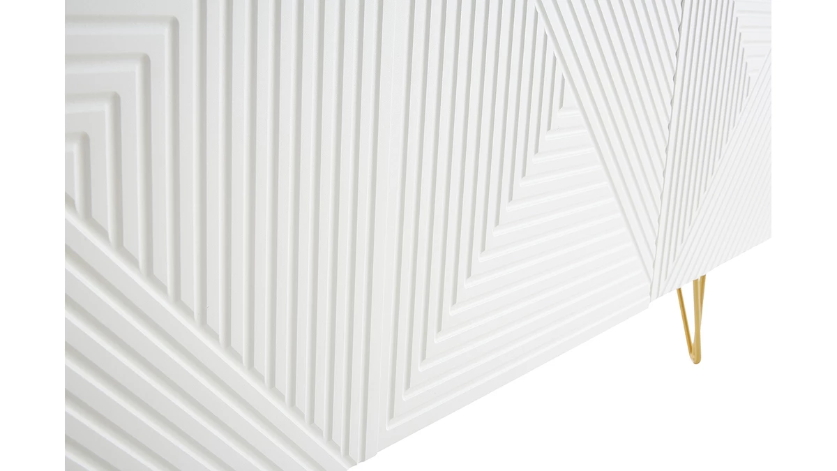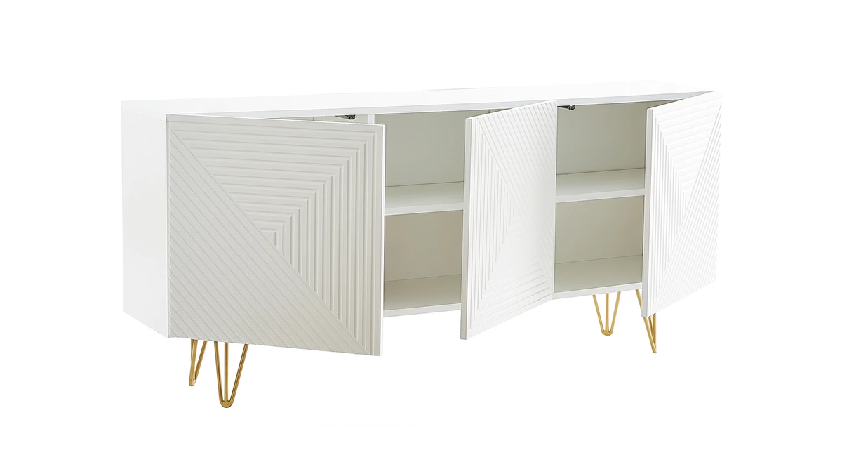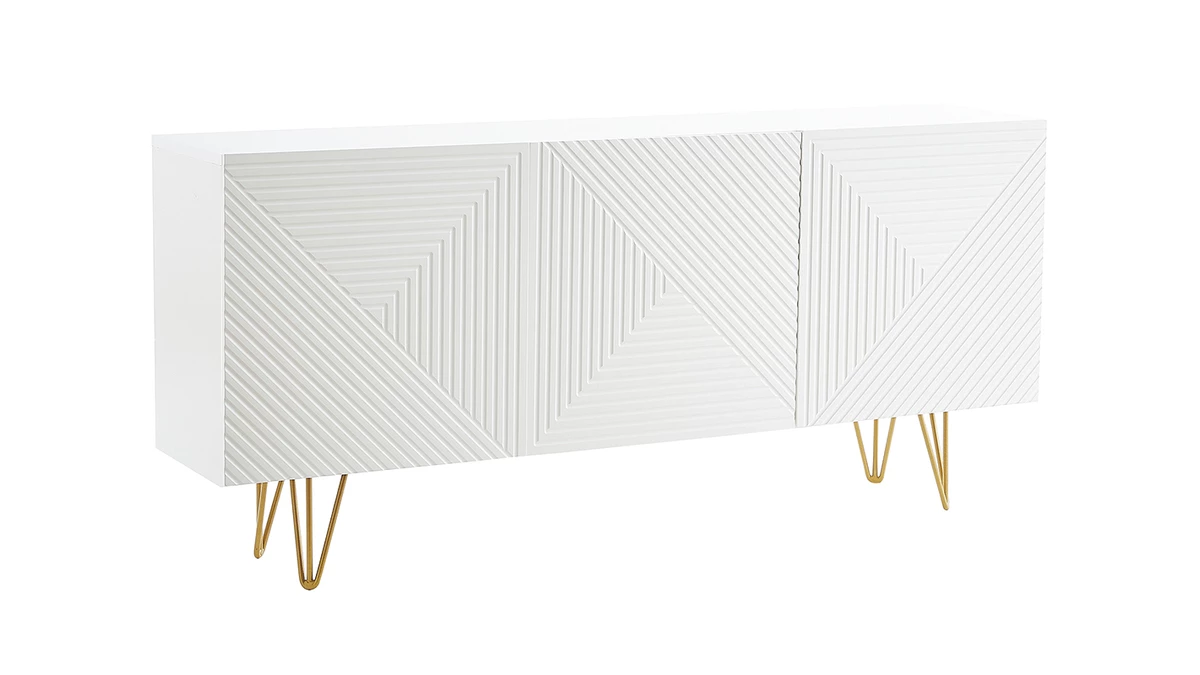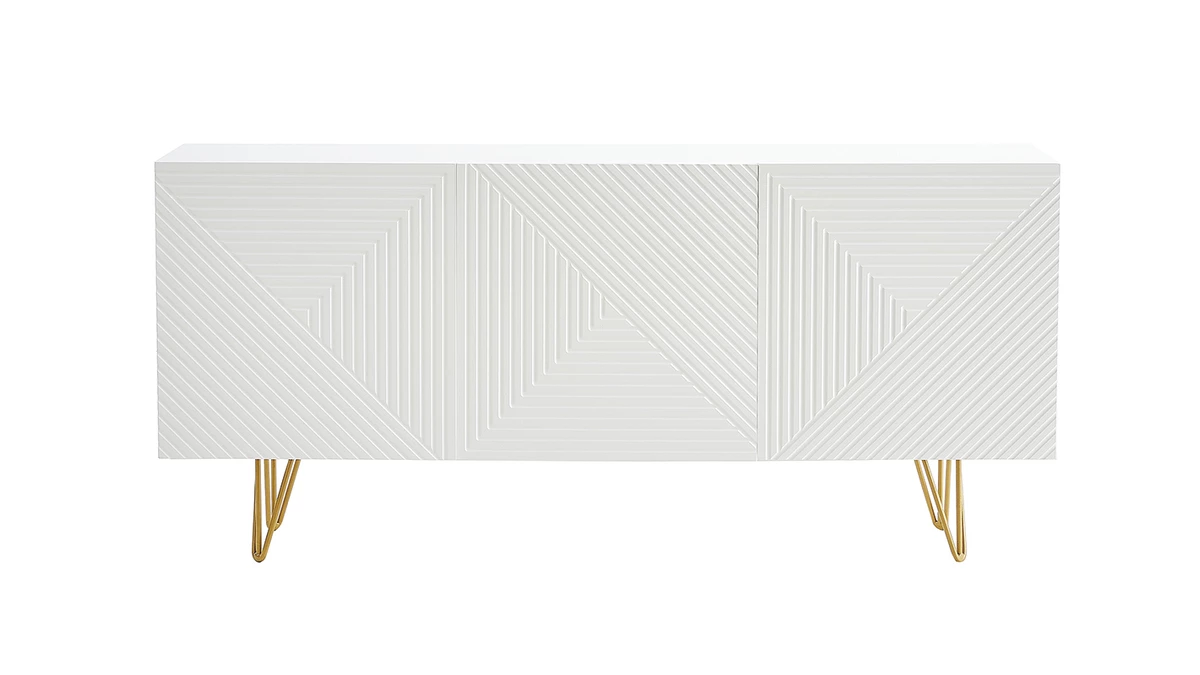 Avec le buffet OZEN, les intérieurs contemporains ont trouvé leur perle rare ! Petit bijou de design, ce buffet moderne se démarque par son originalité. Les trois portes sont ornées d’un magnifique motif géométrique en relief ton sur ton. Atypique mais discret, il fait toute l’élégance de ce meuble de rangement en enfilade. Le blanc immaculé de la structure est réhaussé par un piètement épingle en métal doré. Ce détail chic et coloré est travaillé avec finesse pour un style tout en légèreté.