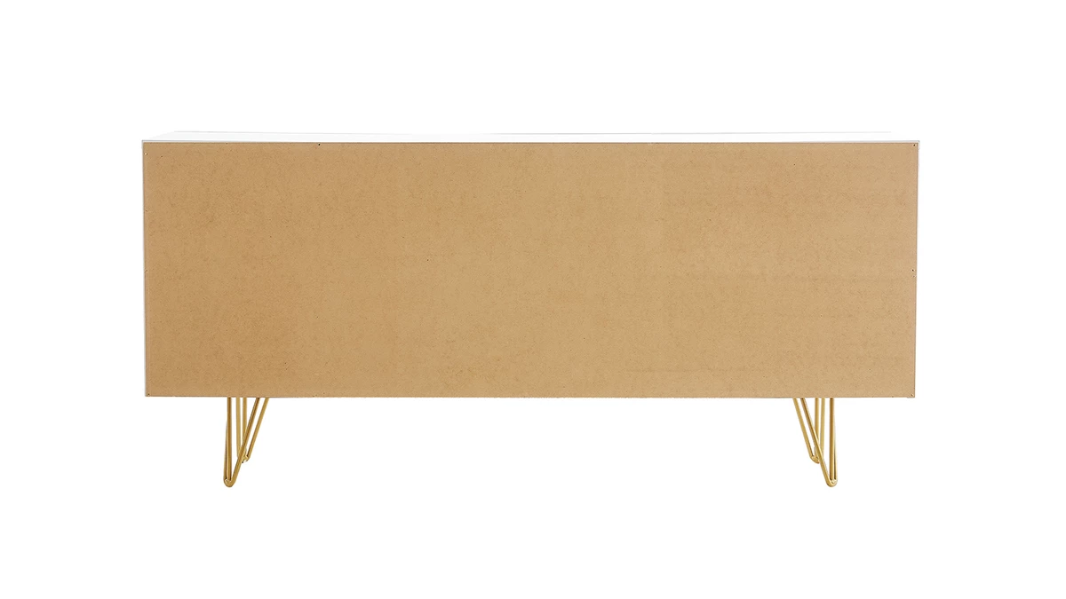 Ce buffet blanc et métal doré n’est pas qu’un bel objet déco. Il renferme six espaces de rangement (L51 x P33 x H25.5 cm) pensés pour organiser la vaisselle ou les affaires du quotidien. Grâce à ses dimensions L160 x P35.1 x H73.4 cm, ce buffet design s’intégrera facilement dans une entrée ou une petite pièce. Une lampe à poser moderne et quelques cadres habilleront à merveille ce meuble design.