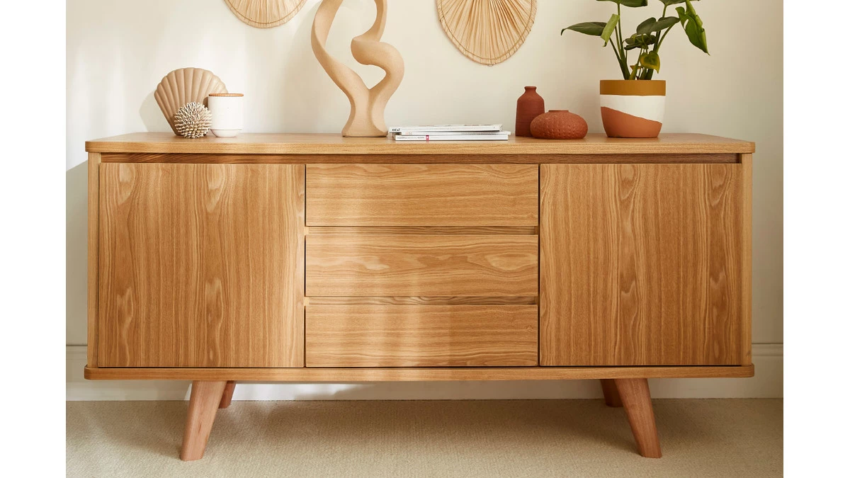 Pour une dĂ©coration d’intĂ©rieur cosy et Ă©purĂ©e, associez ce buffet scandinave Ă des accessoires textiles duveteux aux tons clairs comme un Ă©lĂ©gant tapis. Sublimez le plateau d’une lampe Ă poser – parfait pour profiter d’une lumière tamisĂ©e et feutrĂ©e !