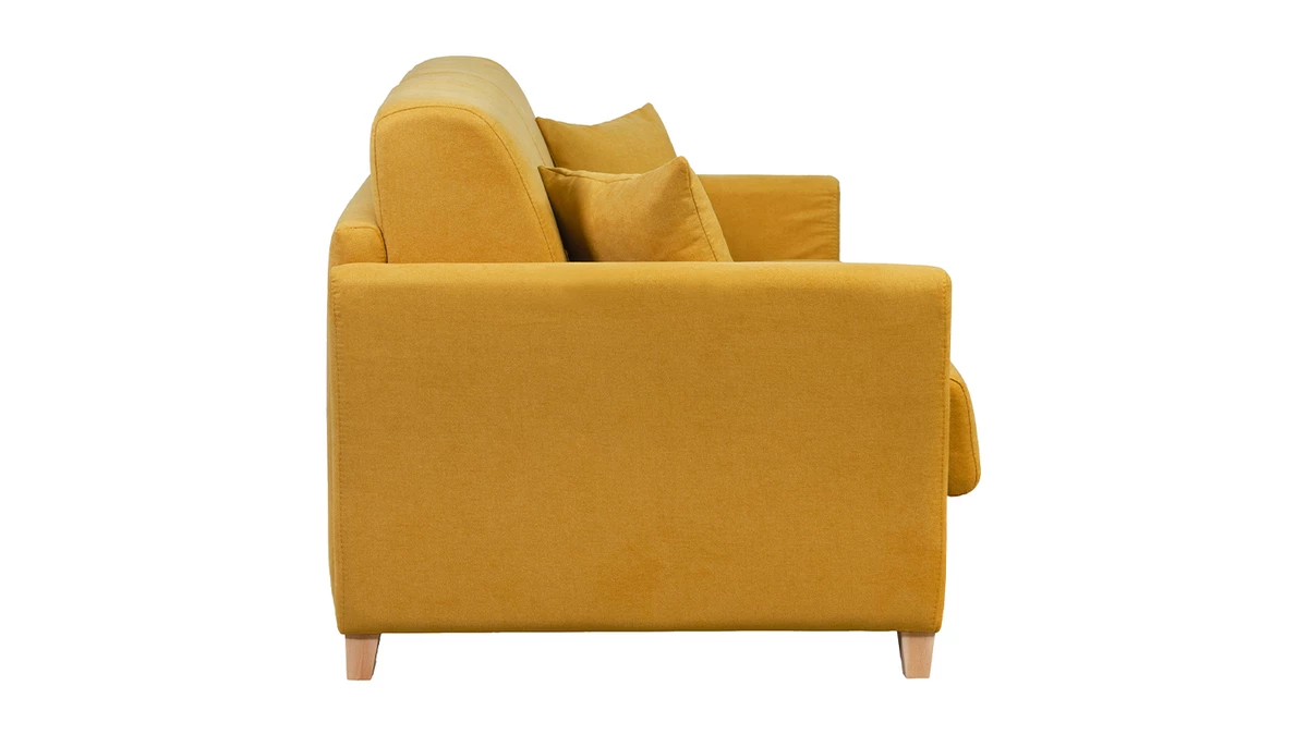 Le canapé-lit SKANDY c’est aussi un joli look scandinave et une couleur jaune vibrante qui s’associeront parfaitement à tous les intérieurs. Pour un salon naturel à l’ambiance cosy, optez pour une table basse en bois et un grand tapis berbère.