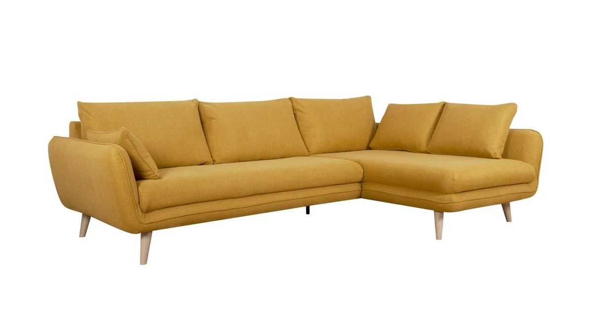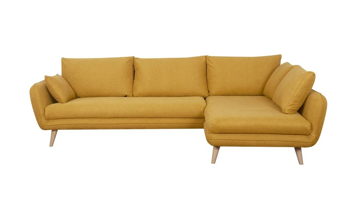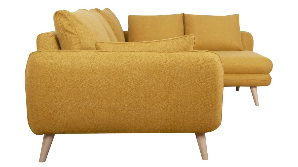 Ce canapé d’angle est une assise aussi pratique que jolie. Son revêtement en polyester jaune cumin en fait un siège dans l’air du temps. Il est accompagné d’un piètement compas en hêtre massif, un bois clair et chaleureux. Sa forme épurée, ses lignes courbes et ses matériaux rappellent tout ce qui fait le charme du style nordique. Pour un salon 100 % scandinave, on complète ce canapé d’angle avec des tables gigognes en bois.