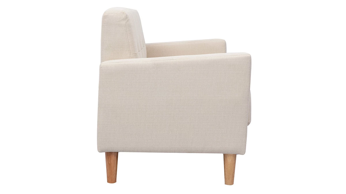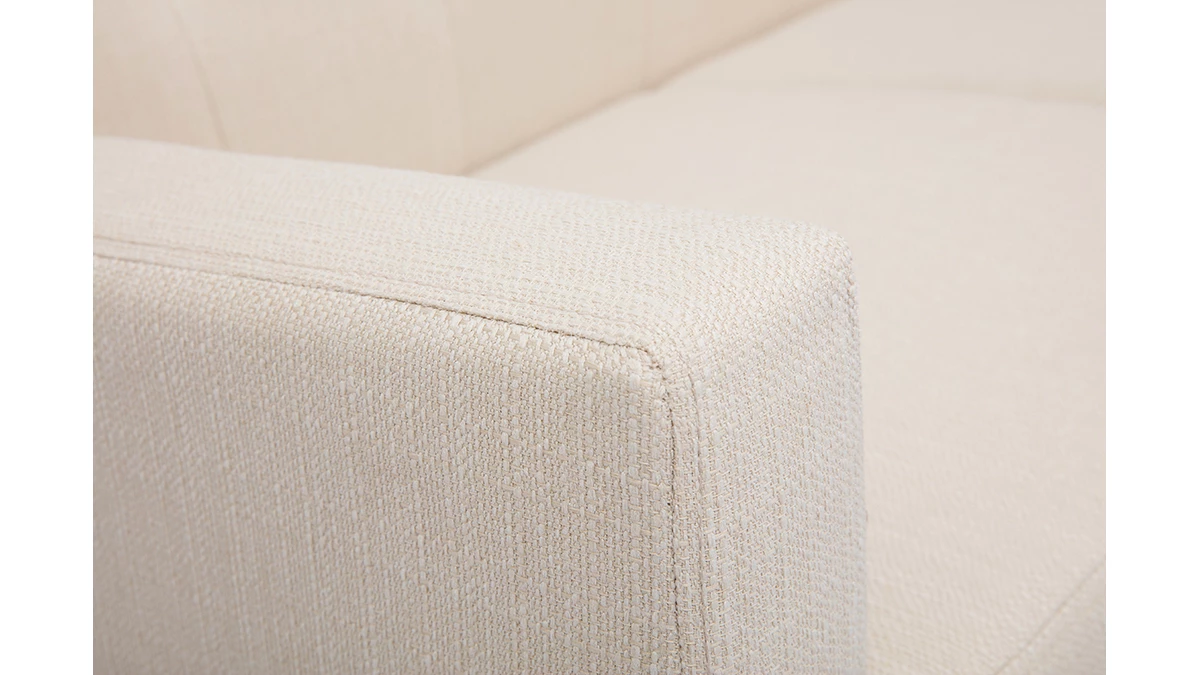 Avec son assise pour deux personnes en tissu beige, il apporte une touche chaleureuse et des teintes douces à votre intérieur. Ce canapé joue sur un subtil jeu de formes et un dossier capitonné qui convient parfaitement à un salon classique ou plus moderne.