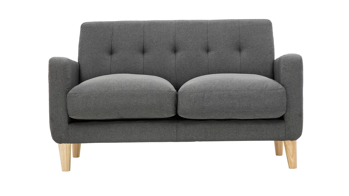 Avec le canapé LUNA, les studios et les petits séjours s’équipent d’une assise gain de place ultra déco. Ses jolies courbes et ses coussins moelleux transforment le salon en véritable petit cocon où il fait bon se détendre. Ce mini canapé associe un revêtement chaleureux en polyester gris foncé avec un piètement naturel en bois massif. Il rassemble les essentiels pour un petit salon cosy.