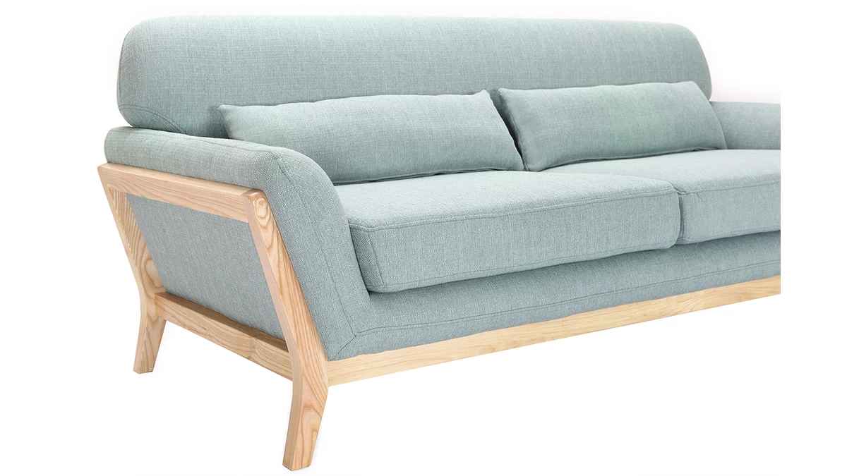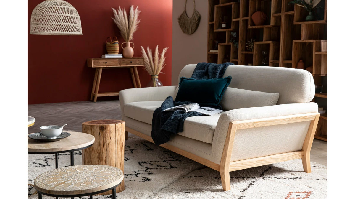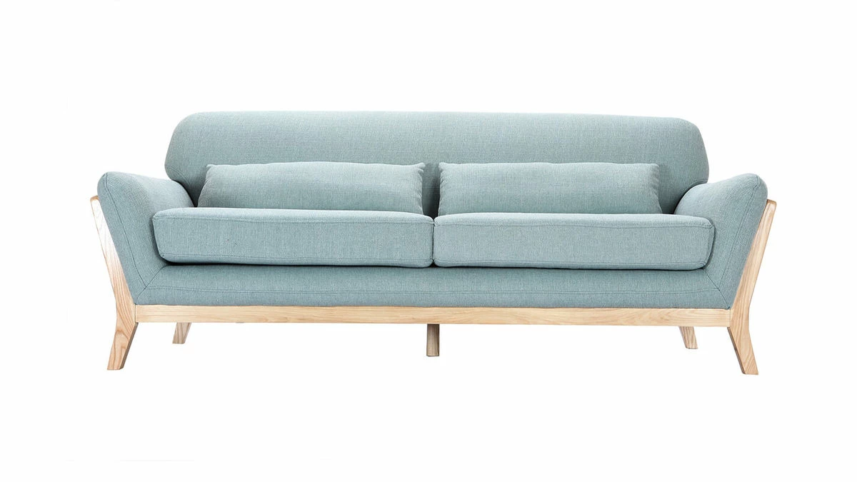Sa structure en bois clair se prolonge au niveau du piètement donnant ainsi une continuité à ce canapé. Avec un revêtement en polyester, ce canapé 3 places YOKO charme aussi bien au niveau des yeux qu’au toucher.
