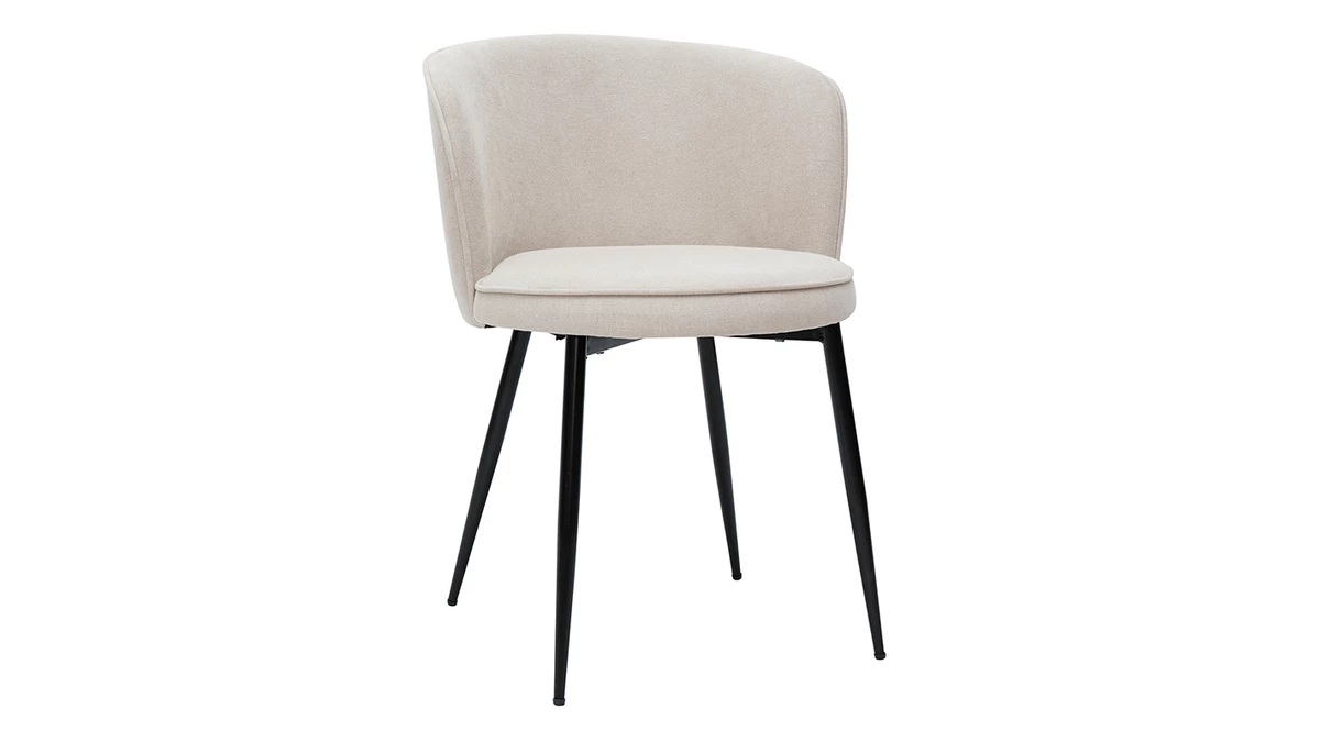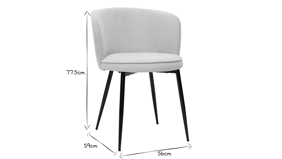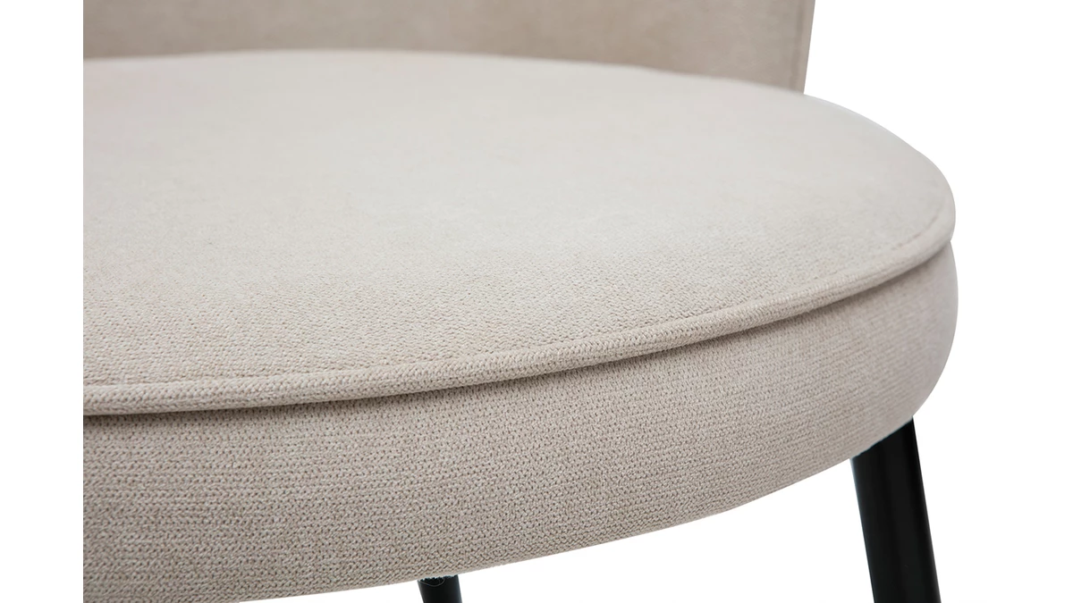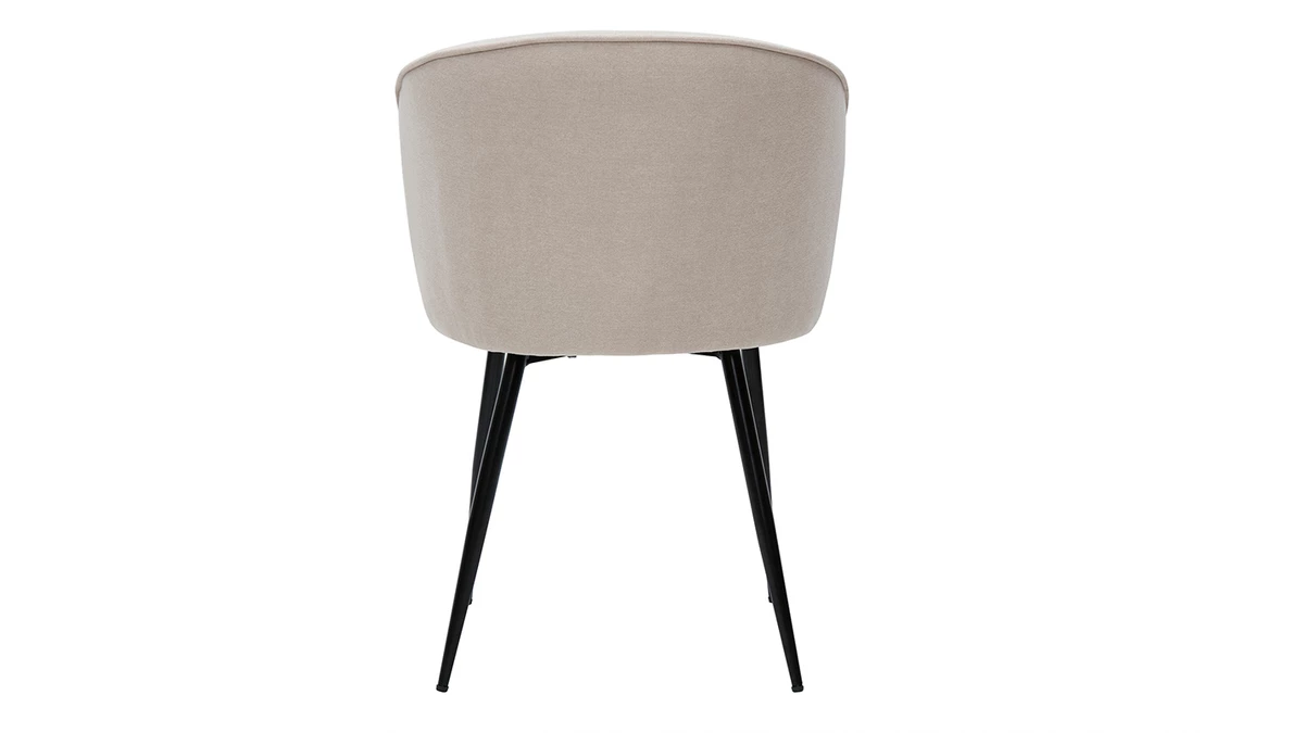 Un modèle de chaise fauteuil qui invite à la convivialité et à la paresse ! Dossier et assise sont rembourrés (densité de la mousse 25 kg/m³) et entièrement habillés d’un tissu effet velours beige (100% polyester) au toucher ultra doux. Avec leurs lignes enveloppantes, ces chaises modernes en tissu beige et métal noir offrent un confort d’assise très appréciable lorsque les repas de famille s’éternisent. Leurs finitions soignées (surpiqûres) et leur piètement fuselé en font des assises à l’élégance intemporelle.