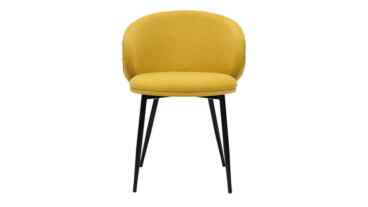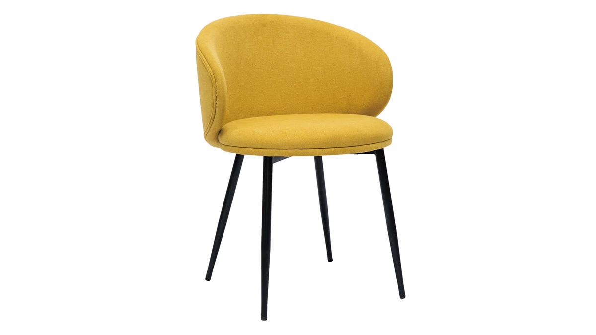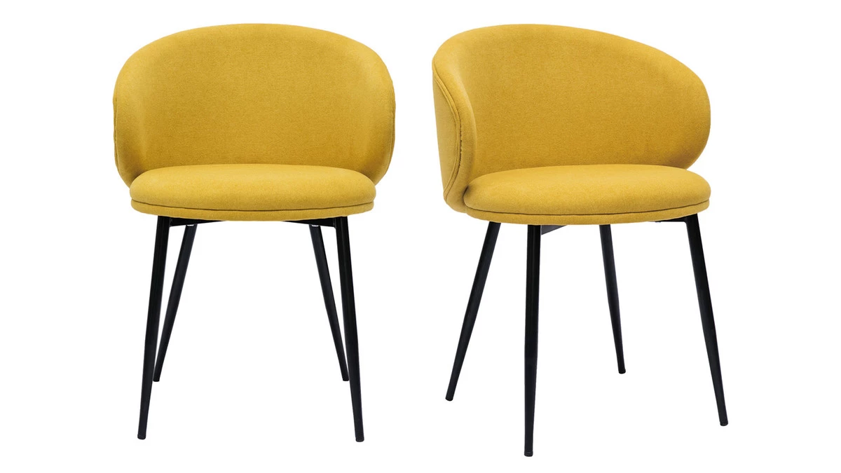 Ces chaises jaune moutarde se distinguent par leur design tout en courbes et leurs finitions soignées. Le large dossier aux lignes organiques contraste avec leur piètement élancé en métal noir. Les volumes s’équilibrent parfaitement.