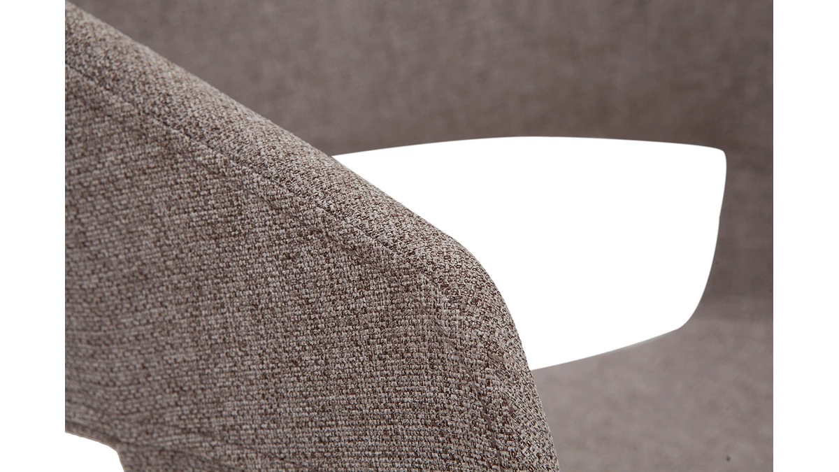 Des formes généreuses qui mêlent équilibre et légèreté pour des repas conviviaux tout confort ! Rembourrés d’une mousse moelleuse (densité 25 kg/m3) pour un agréable maintien, les larges assises accueillantes et hauts dossiers galbés unissent leurs courbes jusqu’aux accoudoirs enveloppants. L’ensemble s’habille d’un revêtement en tissu (97% polyester et 3% nylon), une matière résistante et agréable au toucher. Enfin, les 4 solides pieds placage chêne garantissent robustesse et grande stabilité.