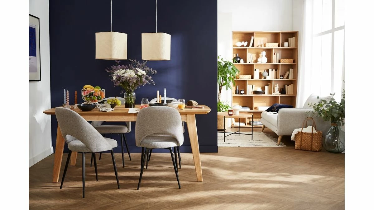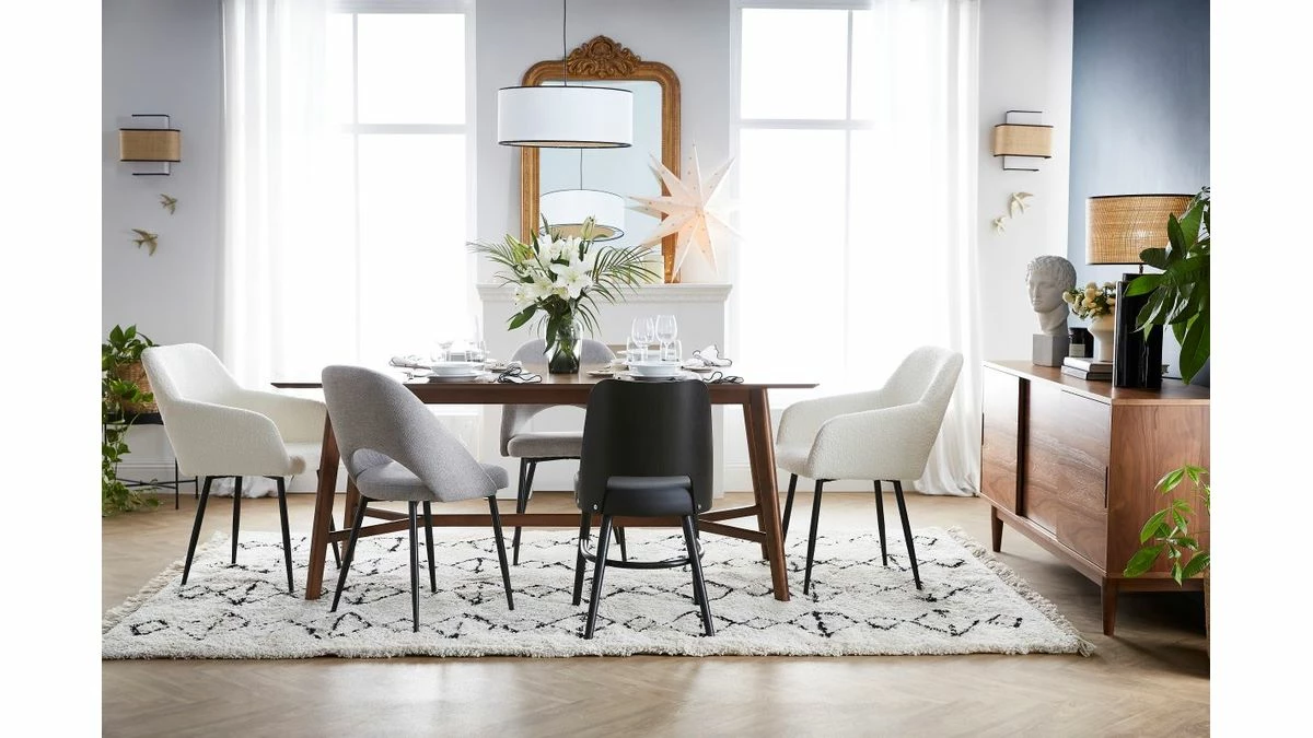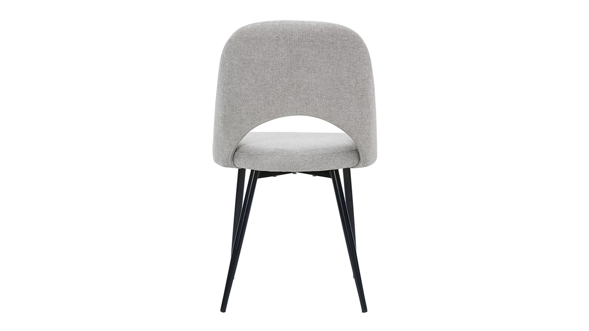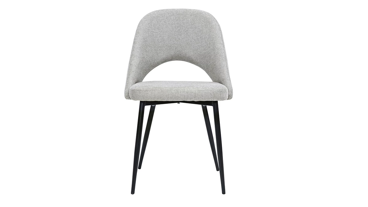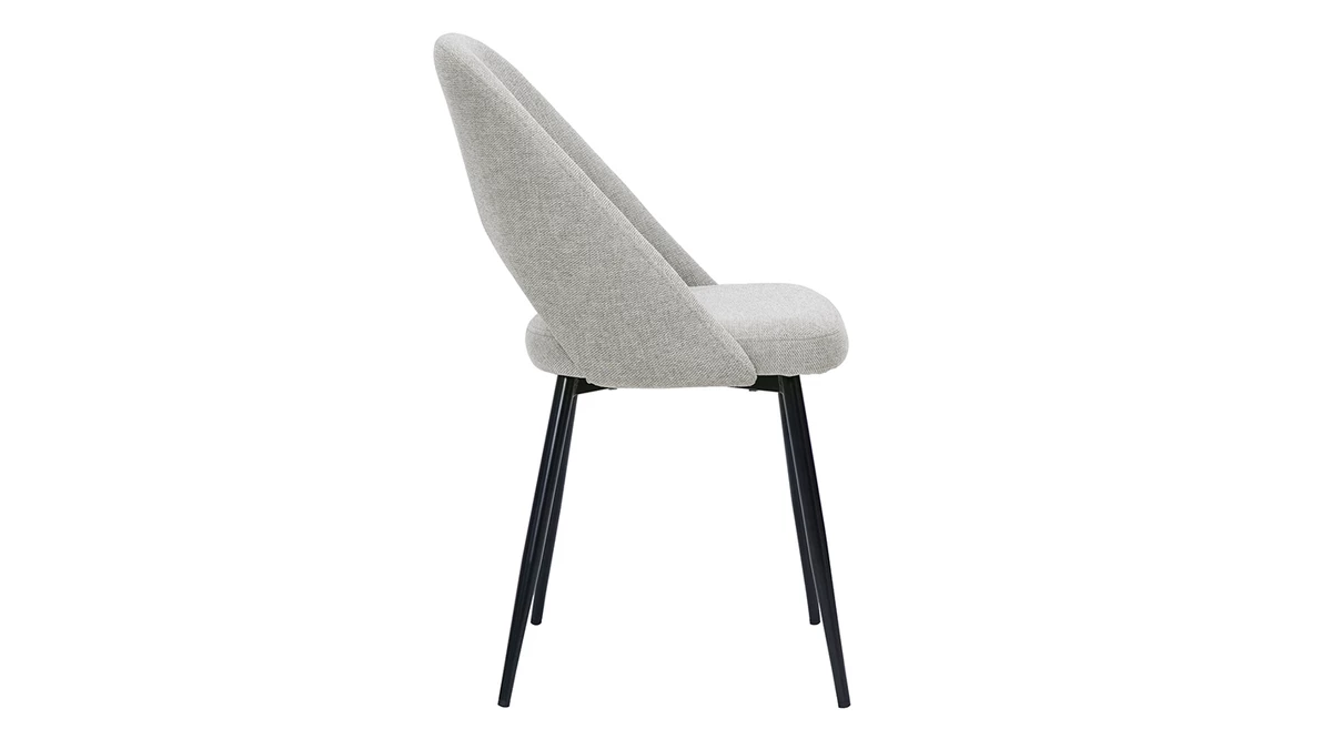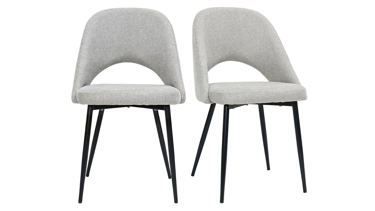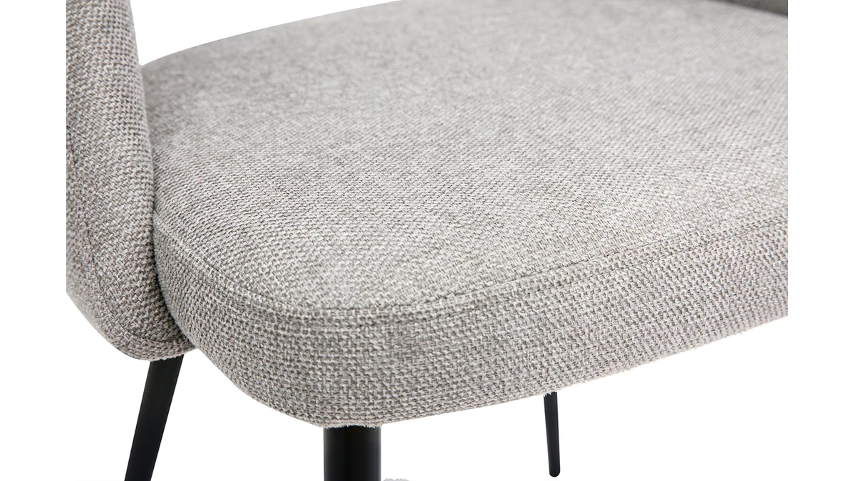 Ces assises au charme subtilement rétro sont synonymes de convivialité et de partage. Leur tissu effet velours texturé (100% polyester) se décline dans un coloris gris élégant et intemporel. Les pieds fuselés en métal noir apportent de la légèreté à la silhouette et s’accordent aisément avec tous les styles de tables à manger.