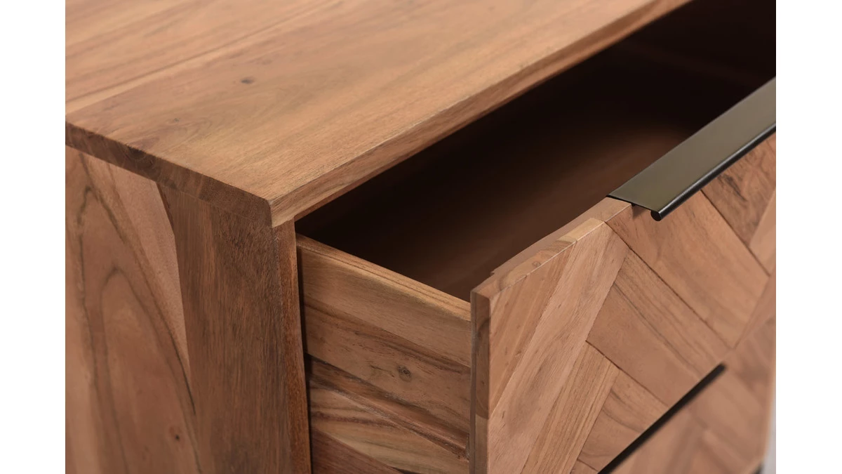 Mêlant avec élégance une structure en acacia massif, un dos en panneaux de fibres de bois et un piètement en acier, cette pièce de mobilier habillera avec charme et personnalité votre chambre à coucher ou votre salon. Le bois massif réchauffera votre intérieur en un clin d’oeil, tandis que le métal noir apportera une petite touche indus’ des plus tendance. On aime particulièrement le motif chevrons qui se dessinent sur les tiroirs. Il donne à l’ensemble un style original et raffiné. Conçue de manière artisanale, cette commode offre un rendu brut unique.