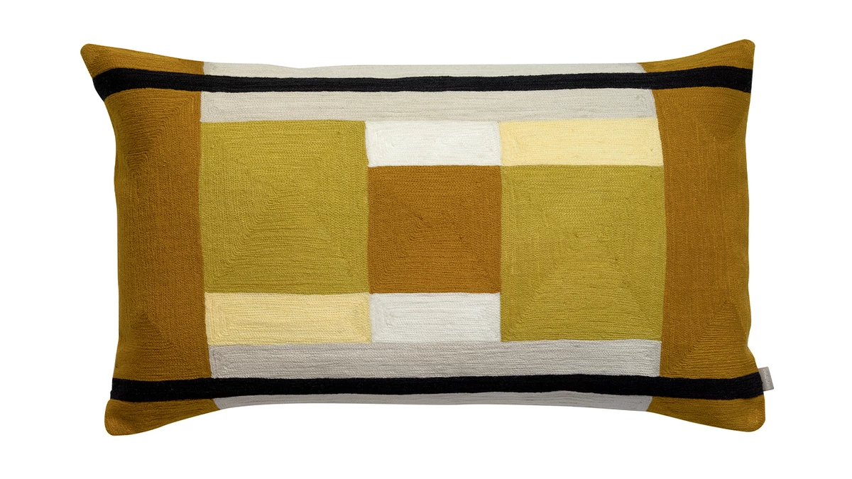 Teintes ensoleillées et motifs géométriques s’unissent pour former un coussin à l’allure unique.