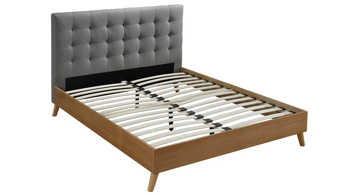 Cadre en bois et tête de lit capitonnée en tissu gris (revêtement 100% polyester) forment un tandem élégant et intemporel. On imagine ce lit 2 places camper dans une chambre d’adulte aux couleurs neutres, où il créera une ambiance cosy à souhait….