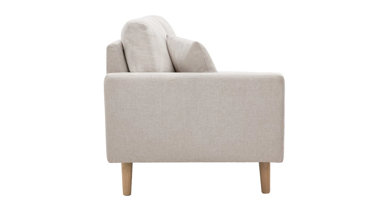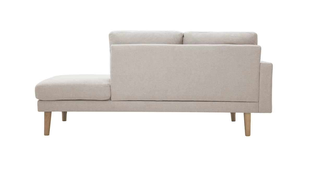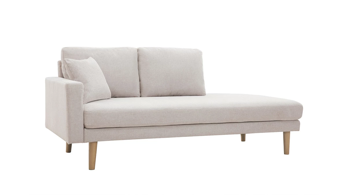 Cette méridienne aux lignes épurées est habillée d’un tissu beige doux et lumineux qui s’accorde à merveille aux pieds fuselés en hévéa (hauteur des pieds 20 cm). Elle est aussi livrée avec un petit coussin supplémentaire (L35 x L35 cm) à placer librement.