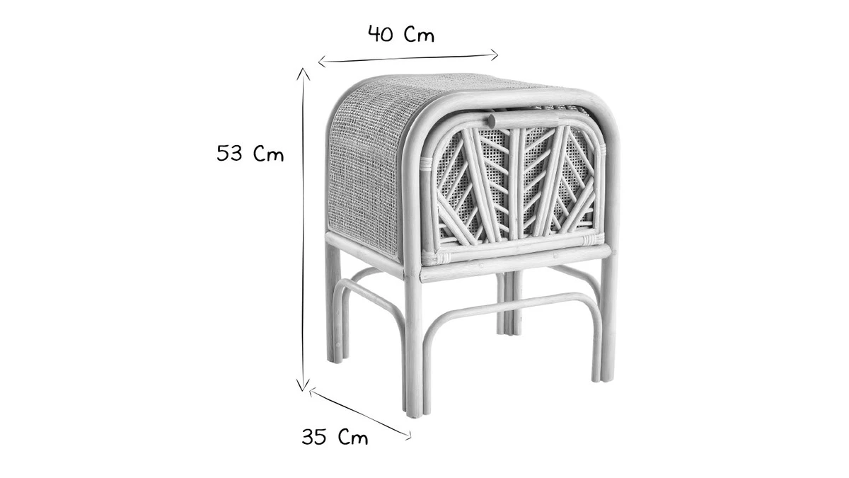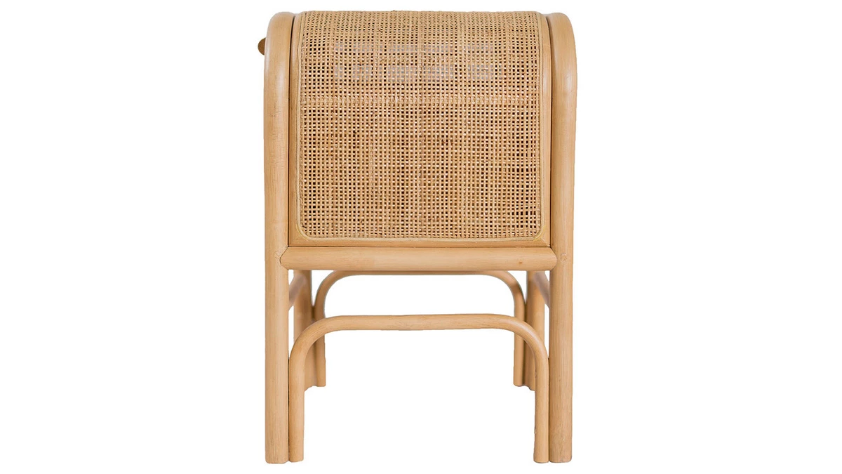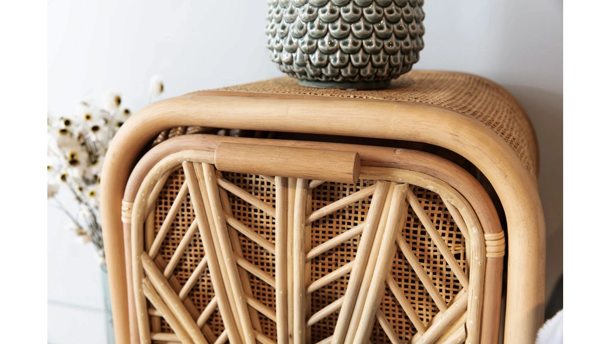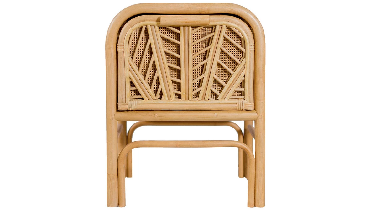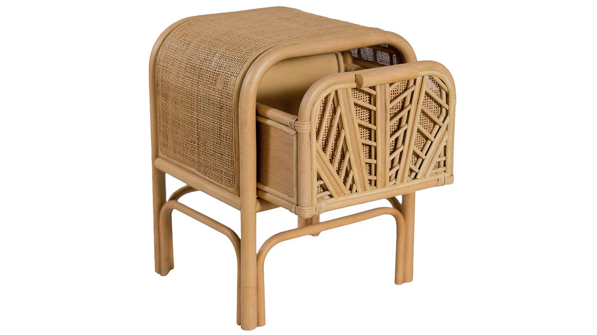 Avec ses formes arrondies et sa structure en rotin, la table de chevet GALON rappelle le mobilier d’antan. Ce matériau au rendu singulier a été travaillé de façon artisanale pour garder tout ce qui fait son charme. Inspiré des nervures des feuillages, le motif présent sur le tiroir apporte une touche d’originalité à l’ensemble.