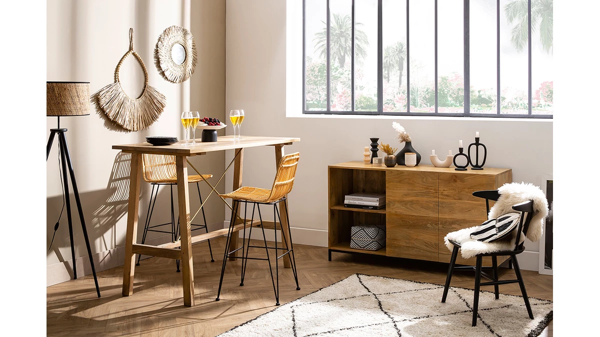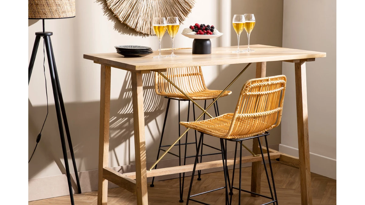 Les tabourets de bar en rotin naturel MALACCA seront parfaits autour de la table de bar en teck BELLINI.