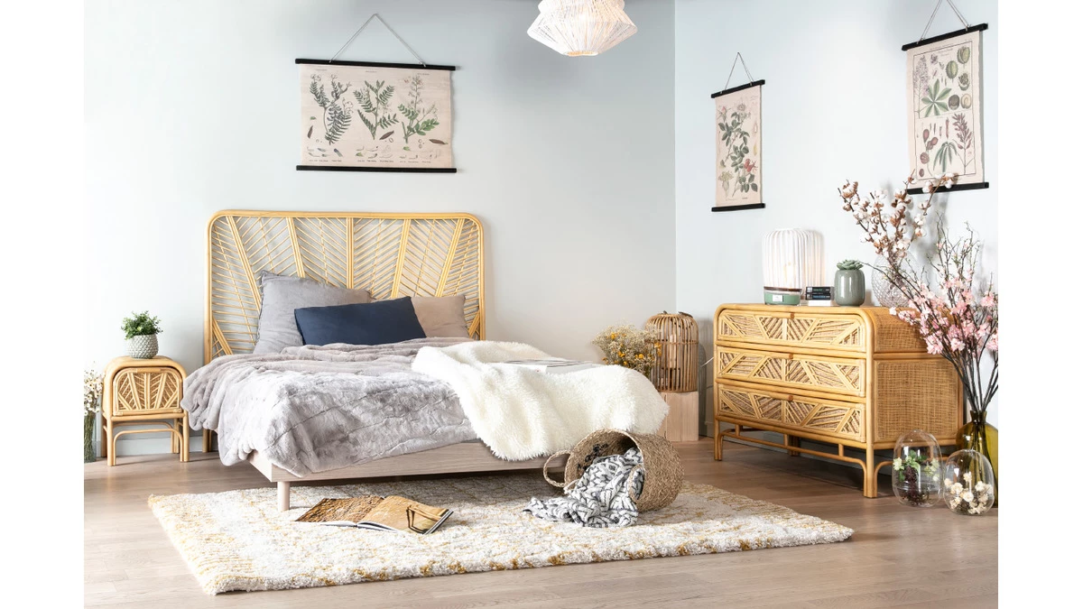 Le motif, inspiré par les nervures des feuilles, trouvera sa place dans une chambre à la décoration naturelle. On aménage son espace nuit avec des matériaux bruts pour un style exotique. La structure en rotin a été travaillée de façon artisanale offrant un rendu authentique plein de charme.